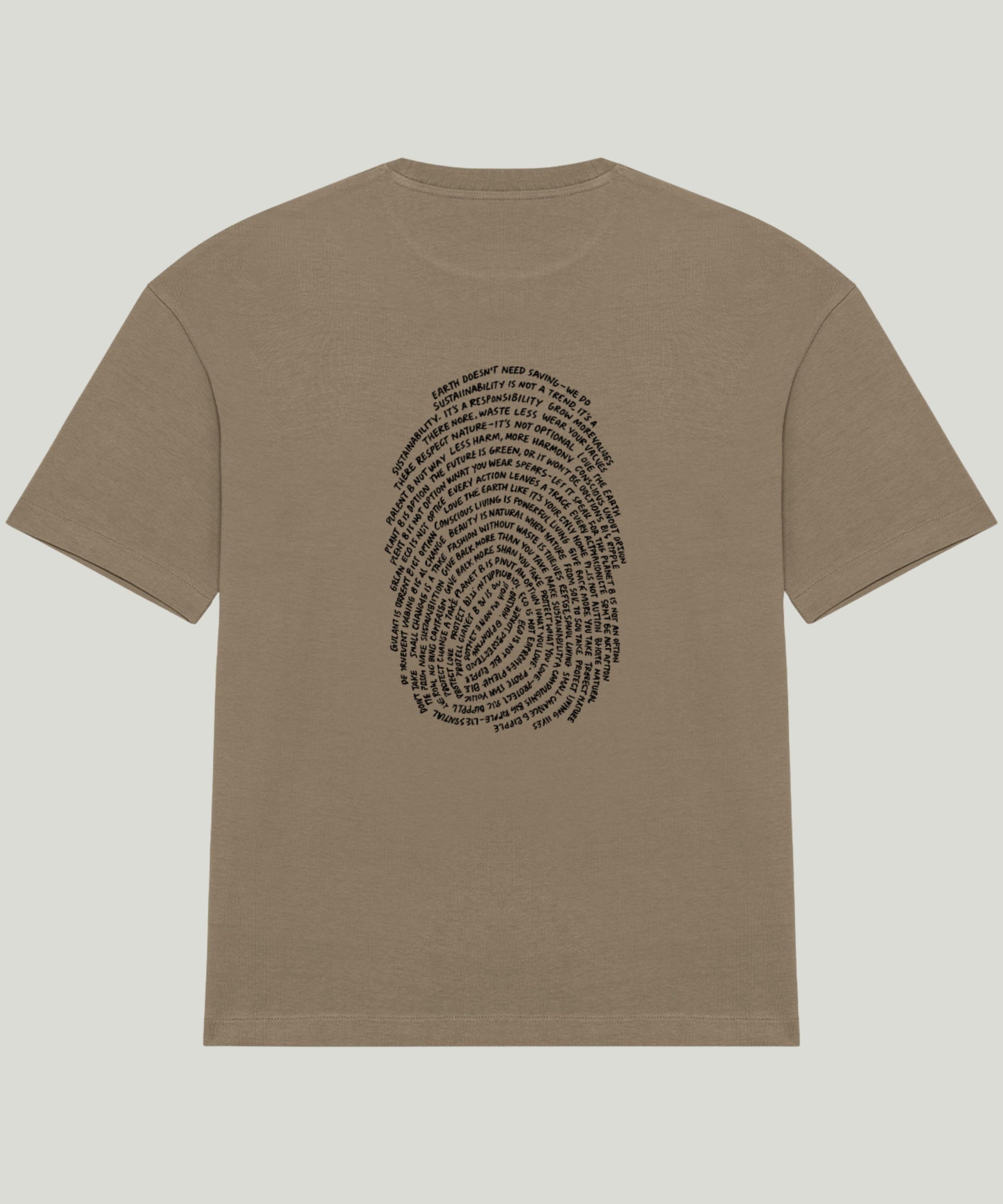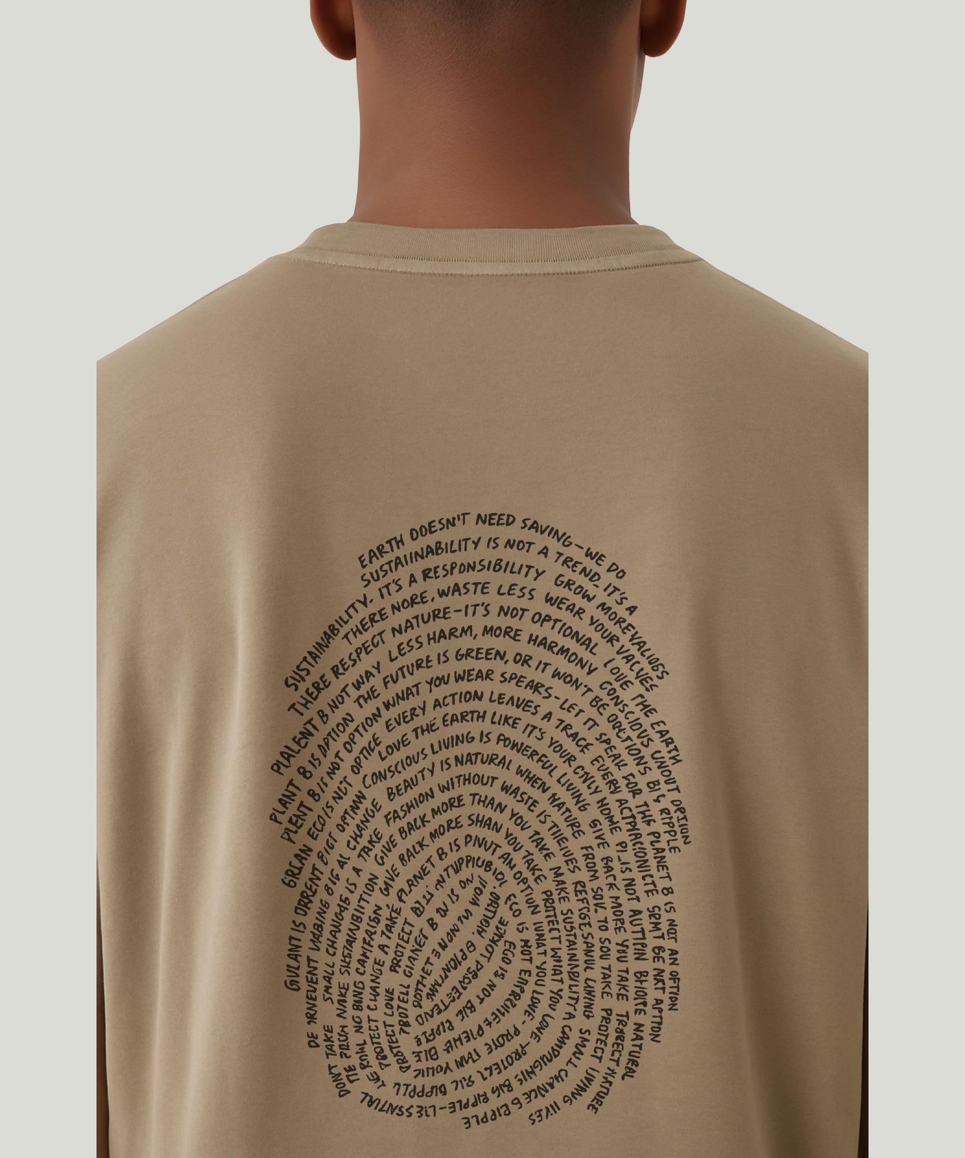 The “Planet B is not an option” oversized t-shirt is more than clothing. It is a statement. Designed in an earthy Driftwood shade with a relaxed oversized fit, it brings together modern streetwear style and conscious design. The back showcases an exclusive fingerprint typography artwork that reflects Earth, care, and responsibility. This piece is a subtle but powerful reminder that your impact matters.
